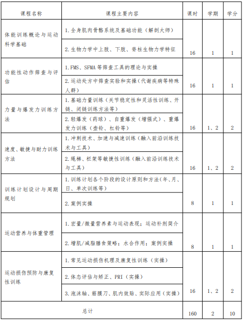 培养系统掌握体能训练基础理论和人体生物力学特征,精通力量、速度、耐力、柔韧等训练方法,具备运动损伤预防与体态纠正等康复知识,能够为运动员、健身爱好者及特殊人群制定并实施科学体能训练计划,提高健康质量的应用型专业人才。