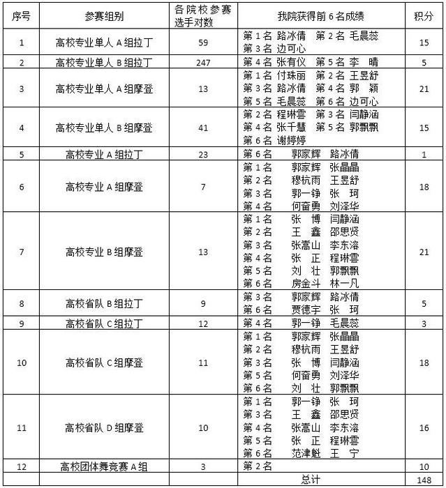 公司体育舞蹈代表队派出了44人的参赛队伍,在教练员栗元辉、于贝贝老师的带领下,同学们顽强拼搏,勇创佳绩,在高等院校专业组14个名次赛组别中,共夺得6项冠军、6项亚军、8项季军,获得138分(14个单项组别总积分294分,公司获得138分),1项团体舞2等奖获得10分,公司最终总积分148分,以绝对的领先优势获得河南省高校团体总分第一名的好成绩。