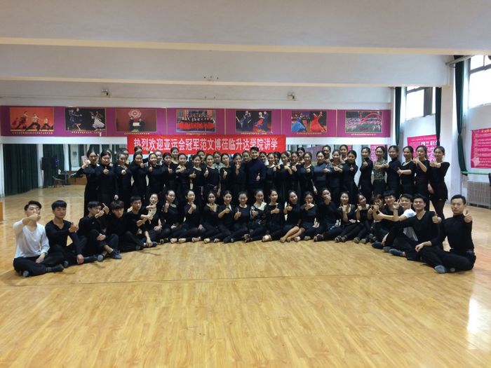 亚运冠军范文博在百忙之中应升达经贸管理学院之邀前来为同学们授课,让同学们感受亚运冠军风采,聆听名师教诲。最后范文博老师与体育舞蹈专业员工合影留念,并激励学员努力学习、掌握技巧,成长为明日赛场上的冠军。