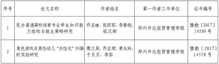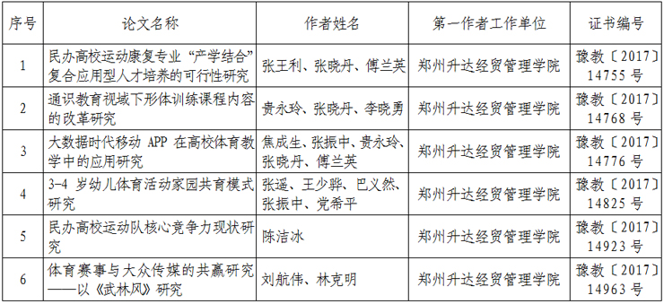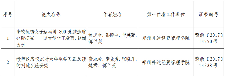 2017年河南省教育厅学校体育科学论文评选活动获奖结果