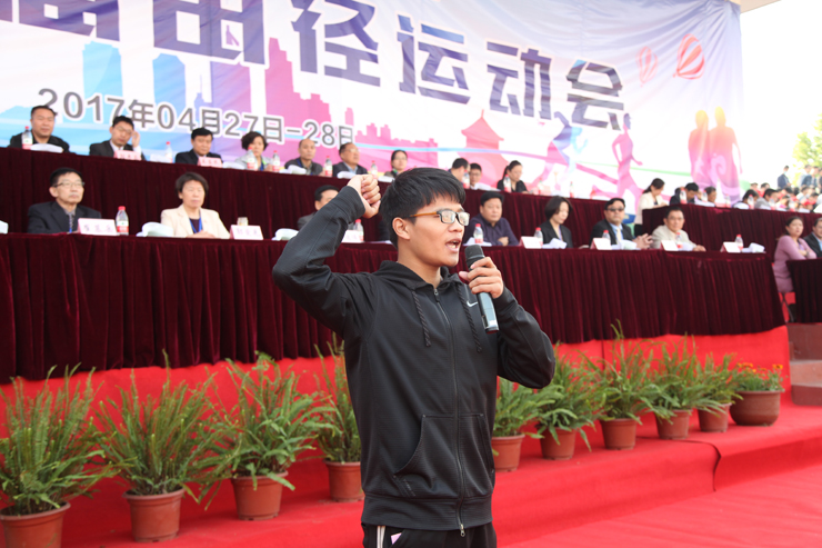 运动员代表张世平同学宣誓:严格遵守比赛规则,奋力拼搏,争取取得优异成绩。裁判员代表刘航伟老师宣誓:严守规程、公正裁决,确保比赛工作顺利进行。