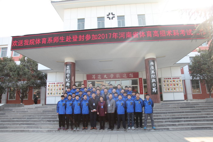 在登封体育考试工作期间,学院招办和体育系领导多次到登封了解工作情况,特别是王新奇董事在百忙中,亲自到登封现场看望慰问同学们,并教导大家一定要认真工作,虚心学习,把这次来之不易的机会把握好,不负学校和老师的期望,圆满完成任务,之后与体育系师生合影留念。
