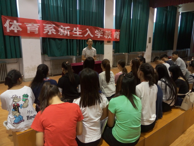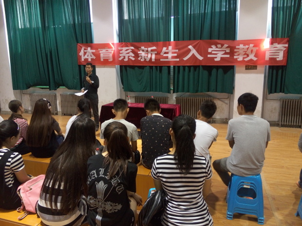 金秋九月,同学们告别了紧张而忙碌的高中生活,步入了绚丽多彩的老员工活。在结束了为期十五天的军训之后,同学们顺利开启了升达大学体育系之门。9月18日上午9点,体育系在体育馆为2015级新生开展了一场精彩而生动的入学教育。参加入学教育的有系党总支书记韩炎涛、系主任张王利、体育舞蹈教研室主任栗元辉、社会体育教研室顾志勇及辅导员高建涛。
