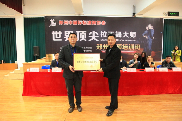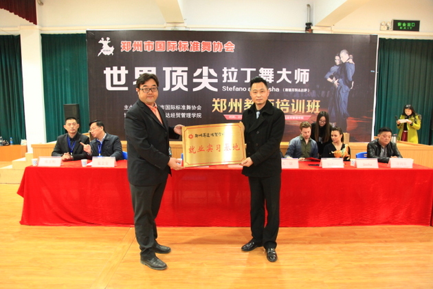 开班仪式上,经理崔慕岳教授代表学院向世界拉丁舞冠军来stefano和Dasha颁发了高级教练员证并赠送唐三彩礼品,执行董事王新奇向郑州市国际标准舞协会会长胡海涛赠送学院就业实习基地牌匾并赠送创办人手书《大同篇》,张金安副经理同参培教师们赠送了礼品,郑州市国际标准舞协会会长胡海涛向体育系主任张王利赠送了国家级教师指定培训单位牌匾。与会代表和师生合影留念。