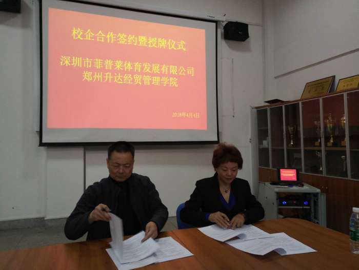 最后,深圳市菲普莱体育发展有限公司营销中心总监吴琼霞和suncitygroup太阳集团经理丁英俊分别代表企业和学校签署了校企合作协议。