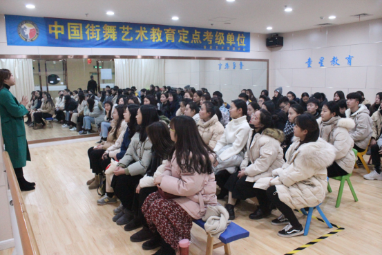 2019年1月2日、3日,由公司体育舞蹈教研室于贝贝老师组织2018级舞蹈表演专业61名员工赴实习实训基地—河南省电视台少儿艺术培训学校进行专业认知实习。基地负责人贾玲董事长向员工们进行了以体育舞蹈员工如何更好的创业、就业等问题的座谈。贾玲董事长首先分享了个人创业经历,讲到了创业起初的种种不易,同时鼓励18级新生要有吃苦精神;而后又分享了现阶段办学的成功经验,强调管理能力、招生能力、教学能力要活学活用,尤其是在校期间尽量多参与社会实践活动,并考取一系列与专业相关的证照。