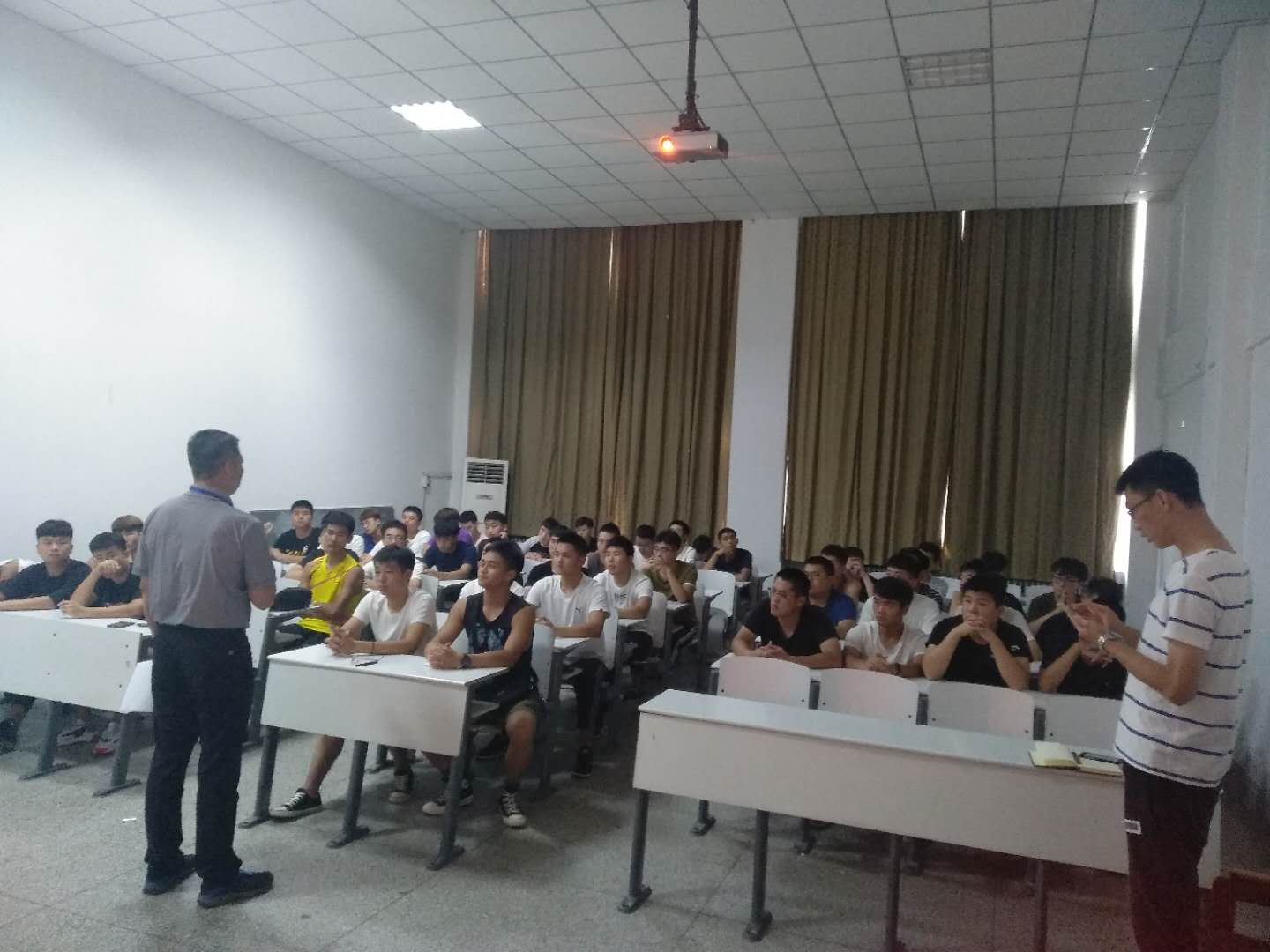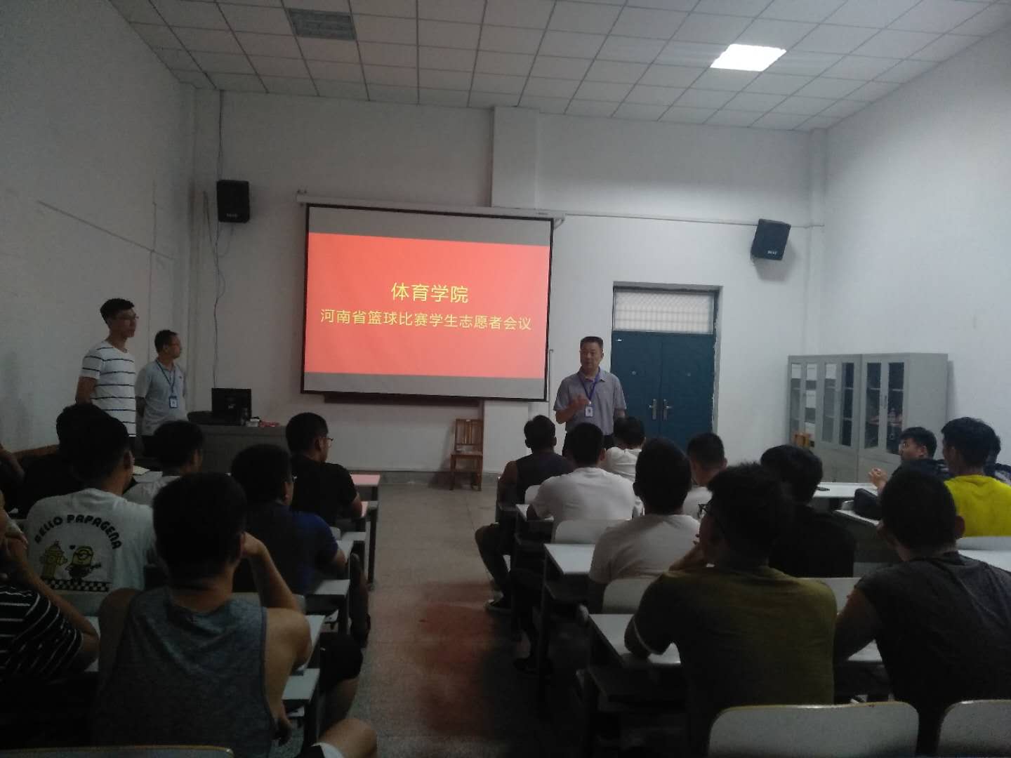 2019年7月8日第27届河南省老员工篮球联赛将在公司举行,为保障比赛顺利举行,suncitygroup太阳集团于6月27日中午在体育馆多媒体教室召开志愿者工作会议。出席本次会议的有suncitygroup太阳集团经理丁英俊、行政秘书高建涛、辅导员陈阳光和康晓晨以及裁判刘航伟老师。