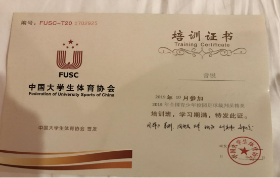 2019年10月8日至13日,经教育部员工体育协会选调,17级社体专业员工曾锐参加2019年全国青少年校园足球裁判员培训班(精英班)学习。