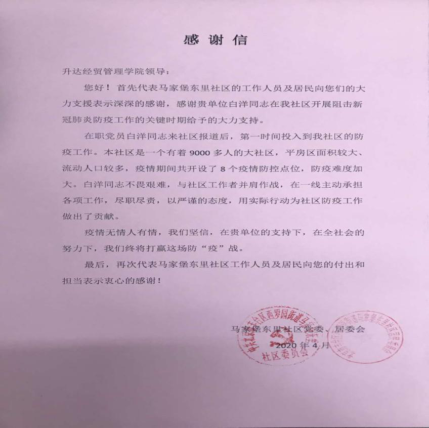 白洋老师返岗后收到在京社区对所在单位的感谢信,辖区对白洋老师疫情阶段的付出和担当给予高度评价。在这场攻坚克难的战役中,白洋老师充分发挥教师带头模范作用,担起党员使命,坚守初心,当好防疫安全的“守门员”。(图文/白洋)