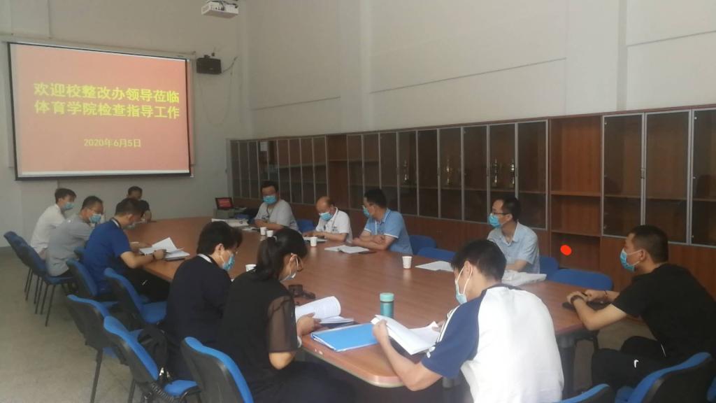 2020年6月5日下午,校教学质量监测与评估中心主任王生龙、办公室主任刘晓川、庞海和孙永杰一行四人深入suncitygroup太阳集团调研评估整改工作完成情况。会议于体育馆208会议室召开,suncitygroup太阳集团经理张王利、教学秘书张振中、行政秘书高建涛、体舞教研室主任栗元辉、社体教研室主任金海波、学院双创专员石丽教授、教学干事张遥和教师代表于贝贝、马少鹏老师参加了座谈会。