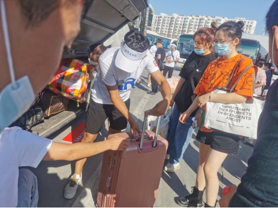 第一次出远门,新同学的行李较多,志愿者帮助他们把行李搬运到大巴车。