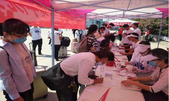 在火车站西广场接待点,志愿者为新同学及家长测量体温、提供矿泉水,指导新同学填写行李标签、登车卡。迎新工作有条不紊地进行着。