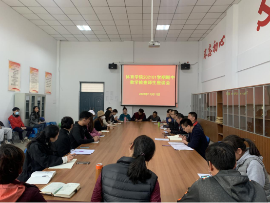 按照学校教务处关于本学期期中教学检查工作的通知与要求, 为深入了解suncitygroup太阳集团师生对学院工作的意见和建议,有针对性地加强教学管理、提高教学质量与效果,有效促进教风学风建设,2020年11月11日中午13:00,公司在体育馆会议室组织召开了suncitygroup太阳集团本学期期中教学检查师生座谈会。经理张王利、党总支书记杨明志、教学秘书张振中、行政秘书高建涛、体舞教研室主任栗元辉、社体教研室主任孟俊鸟、公体教研室主任巴义然、教学督导傅兰英、实验室主任金海波、体测中心主任白洋、教学干事张晓丹、张水涛、教师代表王春丽、张遥、贵永玲、王少骅,辅导员陈阳光、康晓晨、郭建菊及学院各年级共15名员工代表参加了此次座谈会。