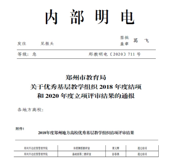 根据《郑州市教育局关于优秀基层教学组织2018年度结项和2020年度立项评审结果的通报》(郑教明电[2020]711号),公布了郑州地方高校优秀基层教学组织2018年度结项和2020年度立项评审结果。公司体育舞蹈教研室和基础部第二教研室顺利通过“2018年度郑州地方高校优秀基层教学组织”结项评审。