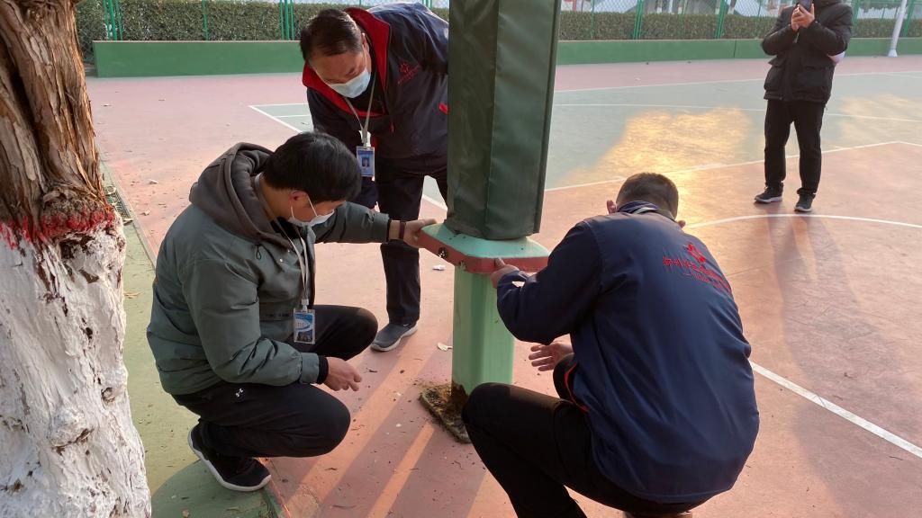 此次重点检查了体育场地场馆、体育器材的安全情况,重点排查了室外篮球场篮筐和底座锈蚀情况。在检查过程中,发现有些篮球架座、排球桩底座锈蚀严重,个别篮球底座因锈蚀严重而倾倒,篮球架螺丝松动、脱落等安全隐患,对存在的安全问题逐一进行了仔细清查,要求对存在的问题会同学校相关部门及时进行处理,确保下学期正常的教学训练和师生锻炼安全使用。