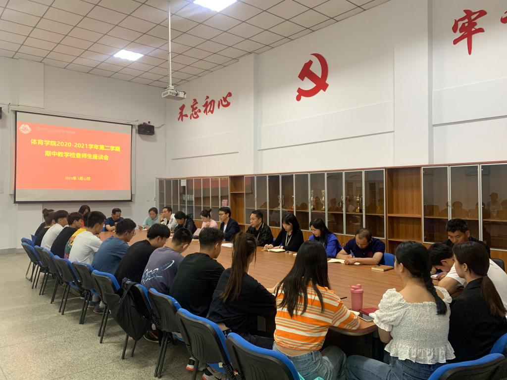 按照学校教务处关于本学期期中教学检查工作的通知与要求,为不断加强教学管理、提高教学质量与效果、有效促进教风学风建设,2021年5月12日13:30,suncitygroup太阳集团在体育馆会议室组织召开了本学期期中教学检查师生座谈会。党总支书记杨明志、教学秘书张振中、体舞教研室主任栗元辉、社体教研室主任孟俊鸟、公体教研室主任巴义然、教学督导傅兰英和杨跃新、教学干事张水涛、教师代表陈洁冰(体测主任)、贵永玲、孙泽野,辅导员陈阳光、康晓晨、郭建菊及学院18、19、20年级员工代表参加了此次座谈会。本次会议由教学秘书张振中主持。