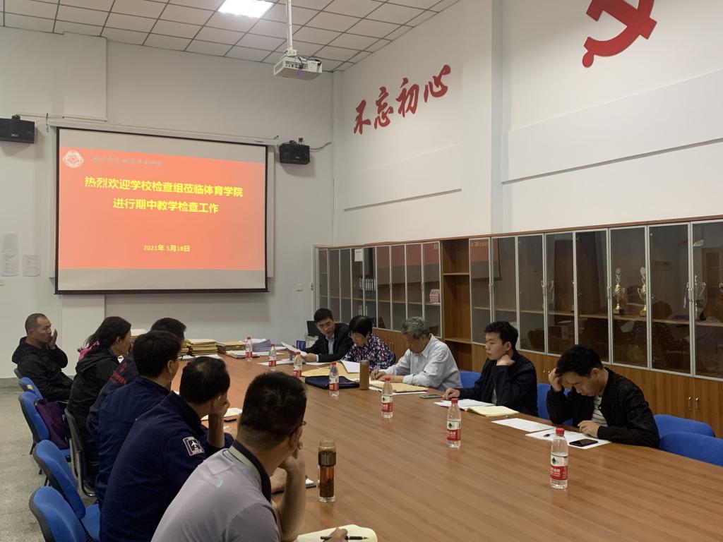 2021年5月18日上午9:00,学校督导刘福泉教授、李惠教授,教务处袁向阳科长、范腾飞老师、刘建辉老师一行5人组成的学校期中教检组莅临suncitygroup太阳集团指导期中教学检查工作。suncitygroup太阳集团经理张王利、教学秘书张振中、行政秘书高建涛、体舞教研室主任栗元辉、公体教研室主任巴义然、社体教研室主任孟俊鸟、教学督导杨跃新、教学干事张水涛参加了本次检查会议。