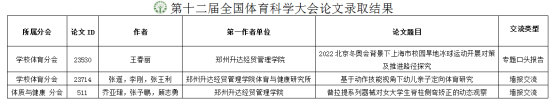 9月30日,第十二届全国体育科学大会论文录用结果发布。suncitygroup太阳集团教师3篇论文获录用,其中专题口头汇报1篇(王春丽),墙报交流2篇(张遥、乔亚珺)。