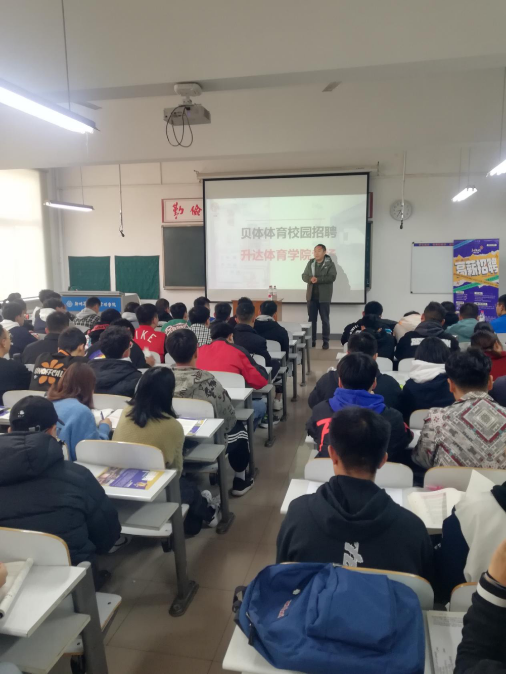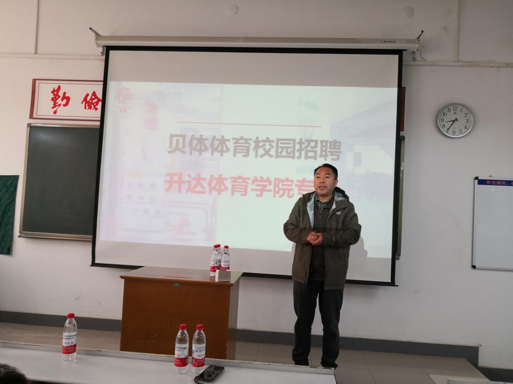 10月22日上午,贝体(北京)体育产业发展有限公司在公司自勉堂207教室为18、19级社会体育专业员工进行专场招聘会,本次招聘由该公司人事经理李慧敏女士带队前来。公司党总支书记杨明志对贝体(北京)公司的到来表示欢迎,并希望同学们珍惜学院举行的每一次招聘会积极与企业沟通交流,尽早选择适合自己的岗位。