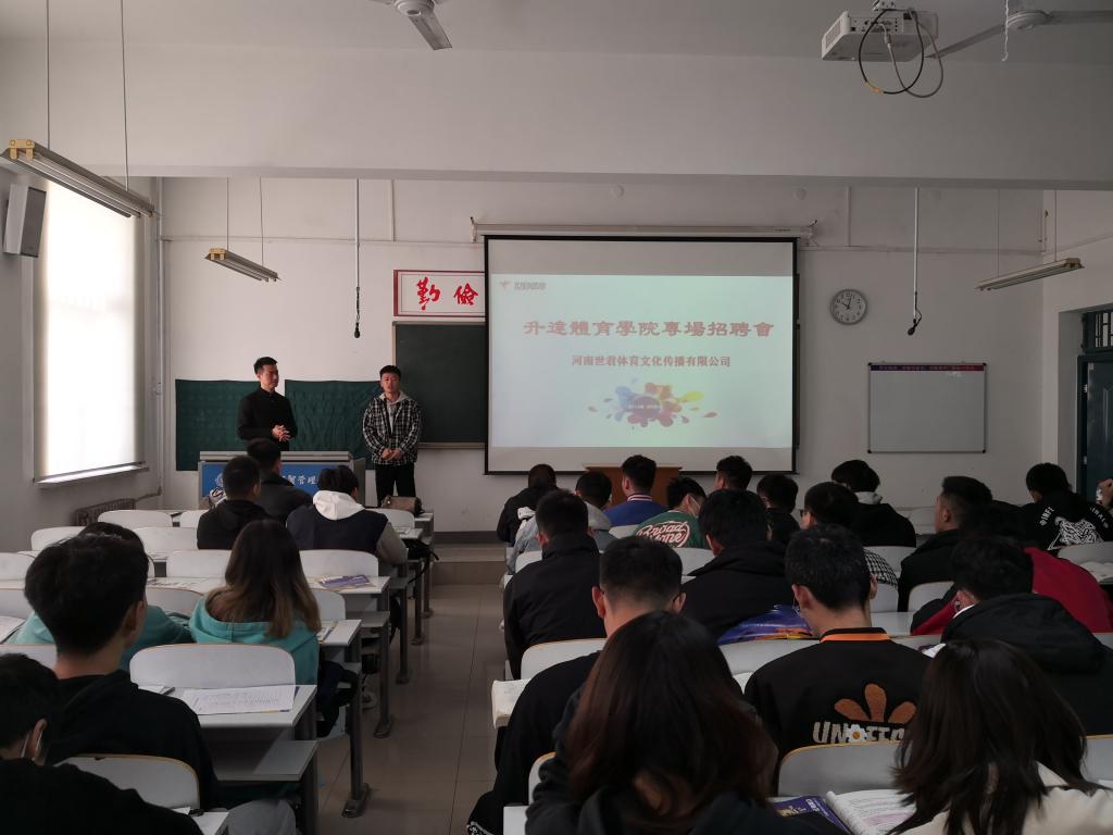 招聘会开始后,河南世君体育文化传播有限公司负责人向同学们介绍了企业的基本情况。包括公司的人才战略、经营原则等。公司负责人也强调,公司非常尊重员工的个人发展,注重员工的学习和培训,及公平合适的晋升机制。又介绍了公司现有的员工状况以及招聘岗位和薪资待遇。