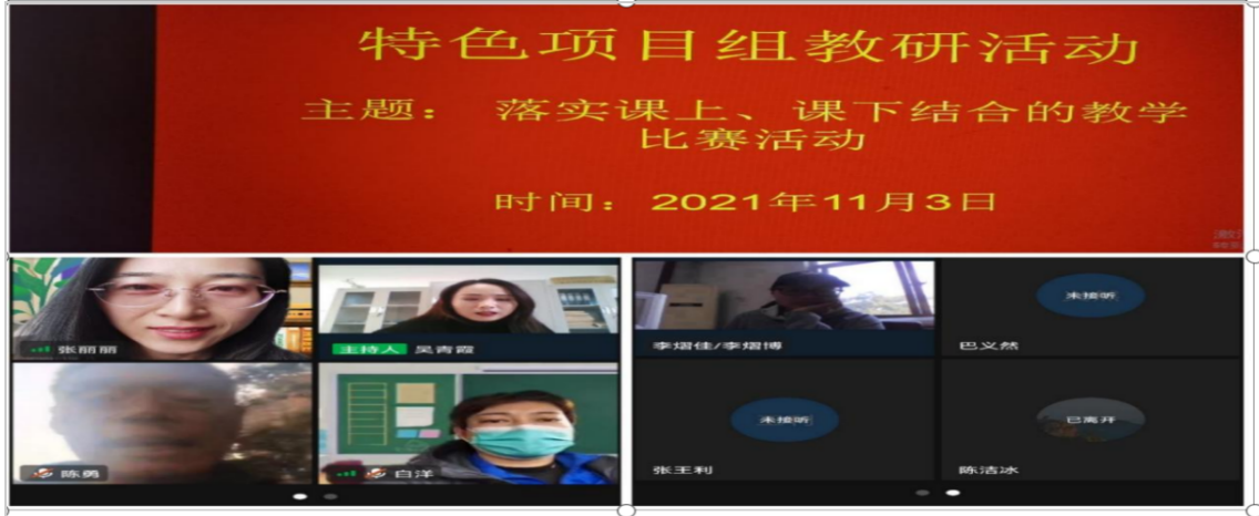 特色项目教研组进行了关于“落实课上、课下结合的教学比赛活动”的教研活动。教研过程中老师们结合自身的项目特点就如何进行课上、课下相结合的教学比赛,分别给予了自己的见解,进行了分享。