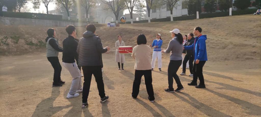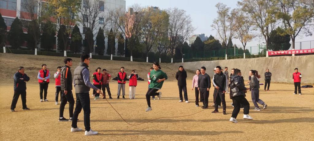 活动伊始,先由裁判张丽丽老师讲解比赛规则,员工裁判队伍做示范动作。全体老师分社体组、公体组、体舞组和行政组四个大组,比赛分集体项目赛和个人项目赛。集体项目为线下比赛,共设“击鼓颠球”“8字绕环跳大绳”两个比赛项目。个人赛为线上比赛,利用天天跳绳APP进行线上角逐。每一个比赛项目既是智慧和体力的角逐,更是团结协作的完美比拼。老师们在比赛项目中玩得不亦乐乎,让大家重拾了童年的记忆!