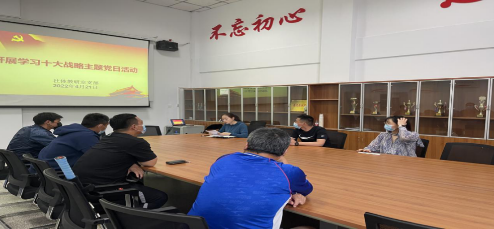 4月21日下午,suncitygroup太阳集团社体教研室党支部在体育馆208会议室,开展学习十大战略主题党日活动。会议由社体教研室支部书记孟俊鸟主持。