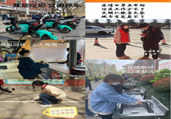 21级体舞一班本次活动中则利用日常生活中的手机摄影,围绕餐厅文明制度,日常停车规范,防疫期间制度等进行拍照宣传,发挥个人能力制作文明标语,而对于日常生活中的不文明行为也及时做出了提醒和制止。