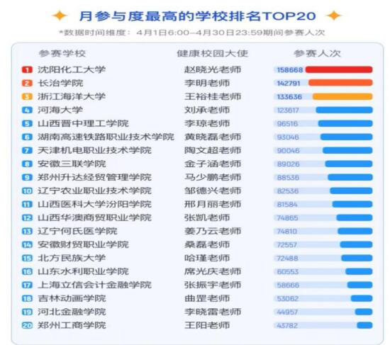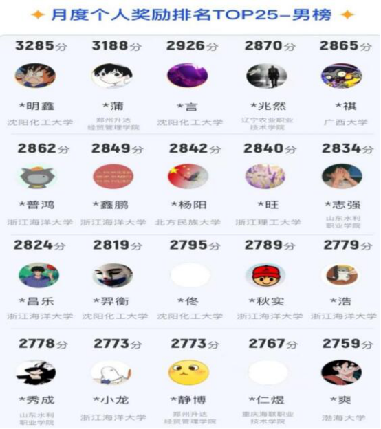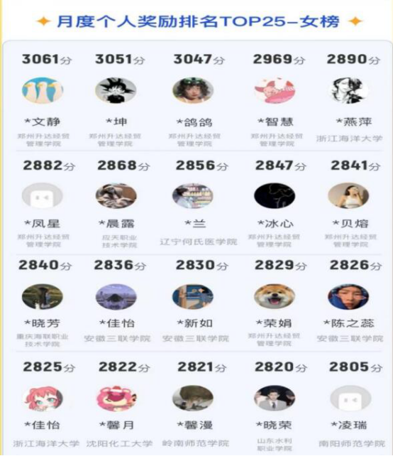 公司9000余名参赛同学来自11个学院,累计参赛14余万人次。在本周官方公布四月份比赛结果中显示:公司名列全国第九名;男子组,会计学院21级石蒲同学获得全国第二名;女子组,suncitygroup太阳集团19级的蔡文静、赵坤、张鸽鸽包揽全国女子前三名,共7位女生进入全国前十。全国男女前100名分别有19和28名队员来自升达队。以上同学分别来自体育、会计、建工、艺术、管理、信工和交通等学院。