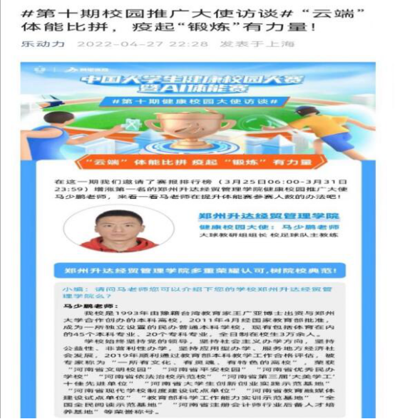 第二阶段开赛以来,在公司书记和经理的号召和鼓励下,各教研室主任积极带头,近三十位老师参加到了活动的组织。特别是马少鹏老师作为公司“健康校园大使”,带领校女子足球队的张鸽鸽、赵坤、周贝熔等同学获得了四次全国周冠军和一次月冠军。主办方邀请马老师做了第十期“健康校园大使”专访,在全国赛事微博和微信平台上对公司进行了报道。月冠军赵坤同学的专访也将在近期发出。