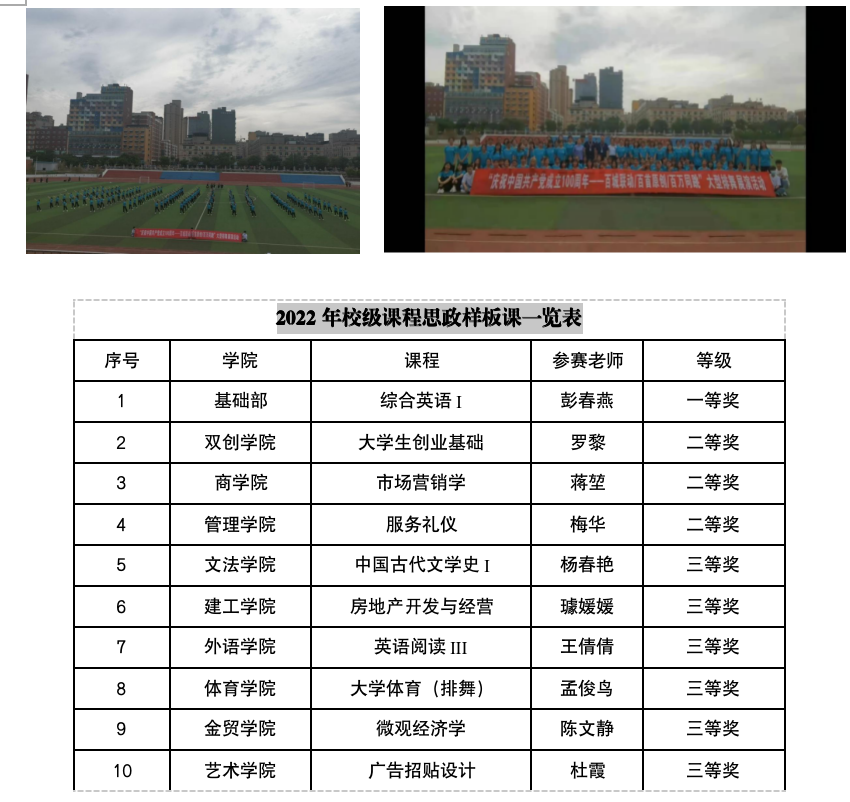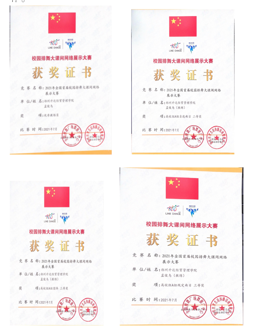 2022年4月份,在孟俊鸟老师带领下,大学体育(排舞)被评为校级课程思政样板课程,2021年6月带领150名员工参加首届校园排舞网络展示大赛中荣获高校组A组规定套路三等奖、自选套路二等奖、集体三等奖的好成绩。同年参加2021年全国排舞“百城联动、百年同庆、百万同跳”庆祝中国共产党成立100周年活动。