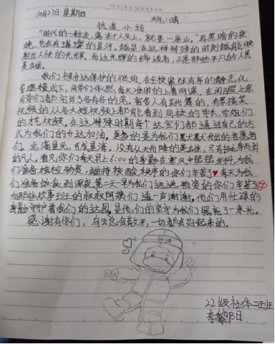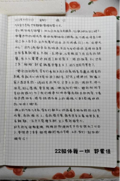 自10月18日起,学校进入静默状态,热闹的校园安静了下来,员工们在宿舍有序生活,校园里到处是老师和志愿者的身影,他们全力保障同学们的生活,解决一切问题。这是升达的一次难关,也是同学们的一次难关。我们唯有团结一致,站在一起。为大力提高同学们的积极性、丰富同学们的疫情生活,suncitygroup太阳集团开展了“抗疫日记”此项活动,鼓励全院同学大力参加。