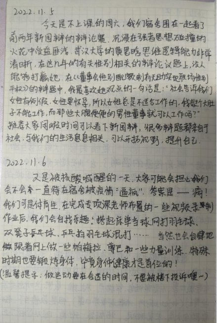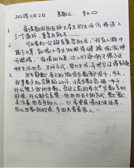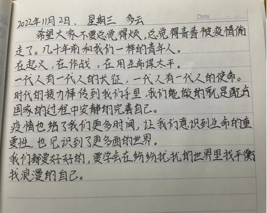 本次活动为期7天,目的是为了充分调动同学们的积极性,缓解大家的焦虑,鼓励大家用自己及手中的笔去记录自己的抗疫生活。大家可以写下自己任何想说的话,可以鼓励自己、赞美志愿者、更可以勉励自己,让在宿舍保持一个良好的状态。在小小的宿舍里,我们照样可以发挥无限的可能。