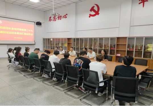 6月2日,校田径队举行参加河南省第二十九届田径运动会赛前集训汇报动员会,suncitygroup太阳集团经理张王利、党总支书记李松涛、教练组孙泽野、陈勇、李春晓、郭松燃等指导老师和全体田径队队员参加了会议。会议由孙泽野主持。