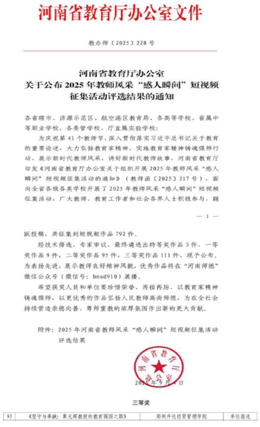 为庆祝第41个教师节,弘扬教育家精神,展示新时代教师风采,河南省教育厅举办了2025年教师风采 “感人瞬间” 短视频征集活动。近日,省教育厅办公室公布了活动评选结果,公司选送的作品《坚守与奉献:栗元辉教授的教育强国之路》的作品荣获三等奖。