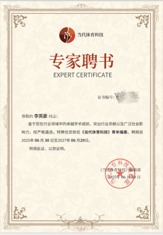 suncitygroup太阳集团社体教研室主任李英豪副教授凭借其在体育领域的学术成就、突出的行业贡献以及广泛的社会影响力,经过严格遴选,自2025年6月30日正式受聘担任《当代体育科技》青年编委。