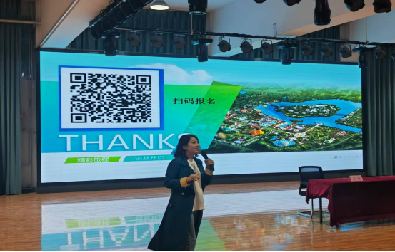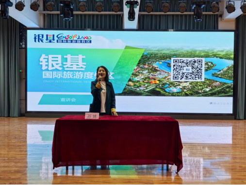 孙总首先进行了企业宣讲,她介绍到银基国际旅游度假区,位于河南省郑州市新密市,总投资560亿元。距郑州东站、郑州新郑国际机场40分钟车程,郑栾高速、商登高速穿境而过,交通极为便利。作为河南省重点文旅项目,银基国际旅游度假区从建设之初便坚持高起点、高要求,以“为游客提供极致的体验感”为己任,以“打造中国文旅行业新标杆”为目标。银基国际旅游度假区已经打造了多个深受游客喜爱的项目,其中包括:国内最具体验感的全新一代动物主题乐园——银基动物王国;国内首座极地生态主题酒店、拥有1314间客房——银基冰雪酒店;中部高品质温泉代表——银基黄帝宫御温泉;国内新晋网红打卡地、全室内冰雪主题综合性乐园——银基冰雪世界;拥有百余项顶尖玩水设备的高品质水上乐园——银基乐海水世界;联合国际顶级马戏品牌,享有“全球十大必看马戏” 之称——银基欢腾国际大马戏;郑州唯一登岛露营的基地——银基云岩湖森林露营地;拥有中原首家尾波冲浪的水上娱乐项目——银基水域俱乐部等。