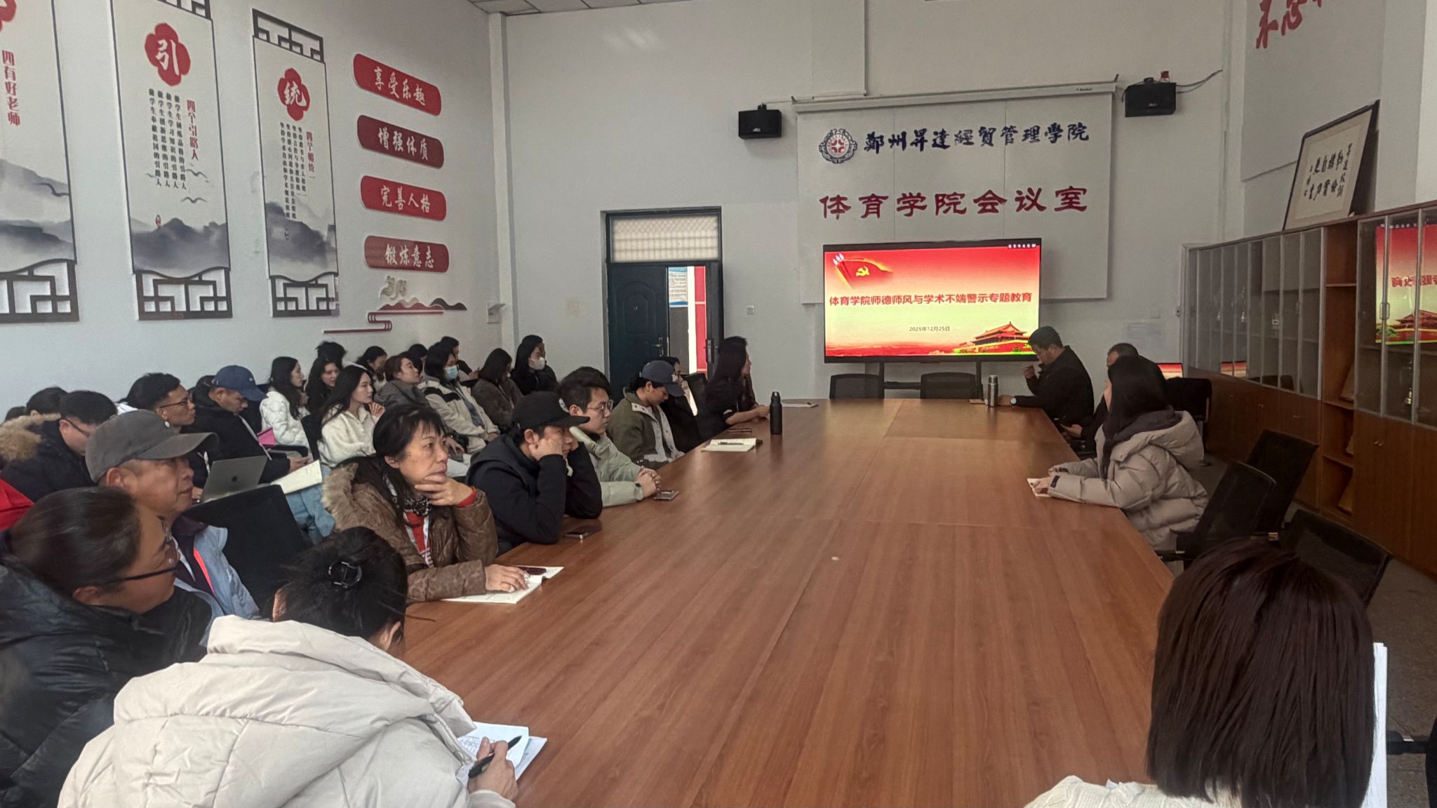 为加强师德师风建设,着力构建“四有”好老师队伍,扎实推进以案促改,12月25日,suncitygroup太阳集团组织召开师德师风警示教育会,全体教职工参加。会议由学院教学秘书王培培主持。