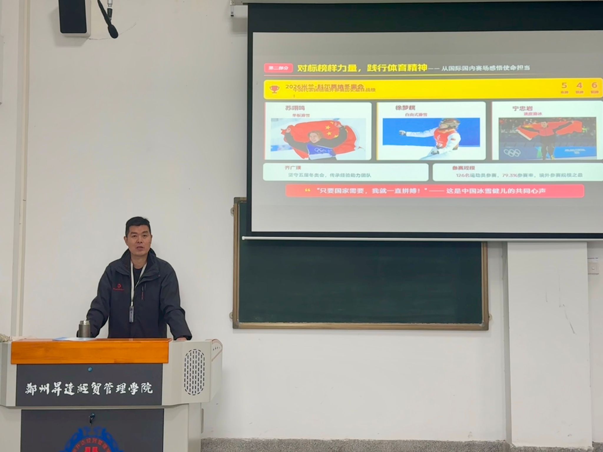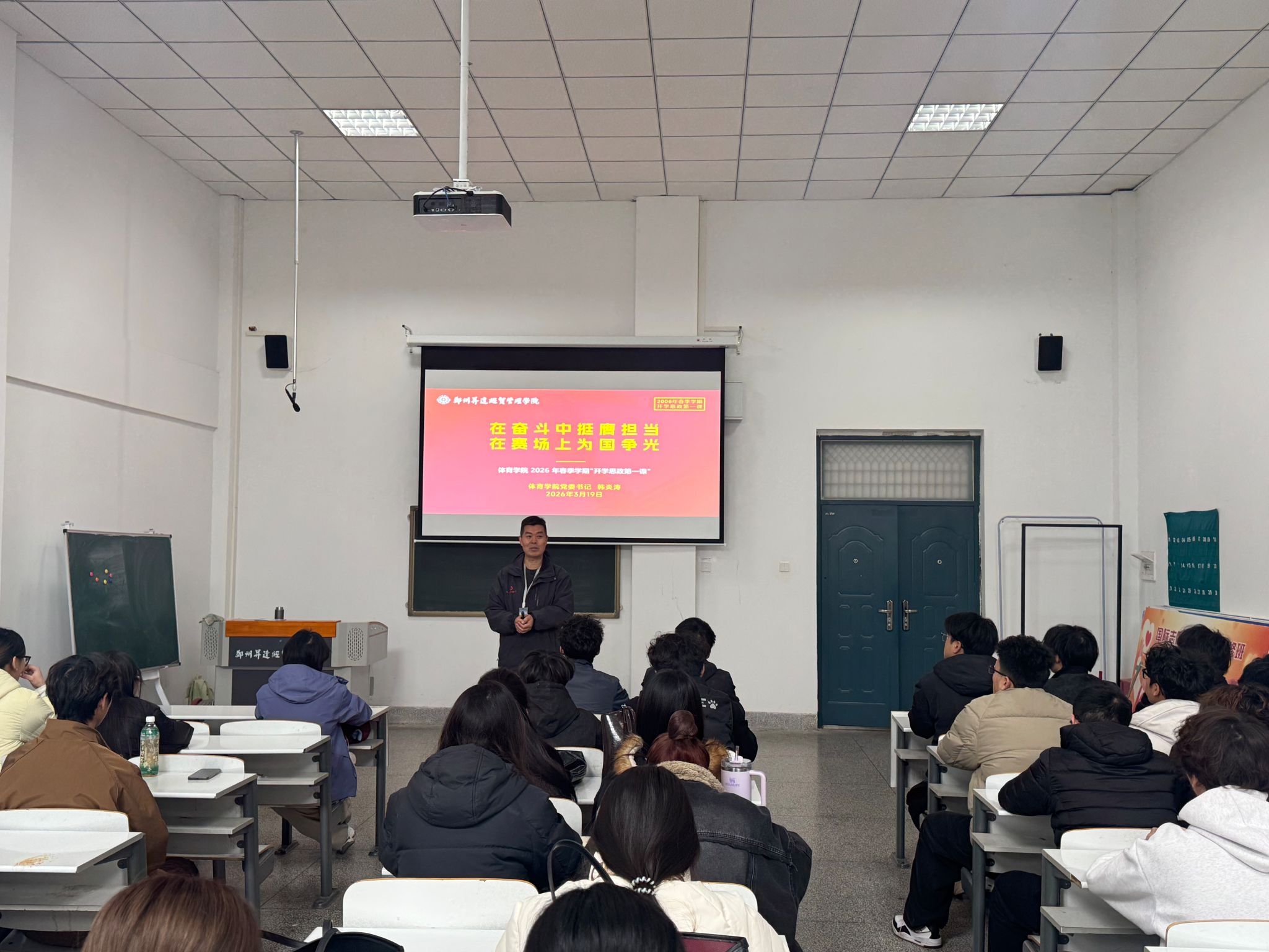 韩炎涛以“在奋斗中挺膺担当 在赛场上为国争光”为主题,从四个方面进行了深入阐述。一是把握时代方位,筑牢思想根基。他强调,必须坚持党对教育事业、体育事业的全面领导,这是中国特色社会主义教育体育发展道路最本质的特征和根本保证。广大体育学子要心怀“国之大者”,将个人理想追求融入党和国家事业发展全局。二是对标榜样力量,践行体育精神。他聚焦米兰冬奥会、十五届全运会和学校运动队的典型事迹,生动诠释了“奋勇拼搏、突破自我、创造历史,用汗水浇灌梦想,用行动证明实力”的体育人担当,激励同学们从体育楷模身上汲取拼搏向上的精神力量。三是聚焦育人核心,明晰实践路径。韩书记指出,要坚持以科技创新为核心驱动,以数字赋能为重要支撑,以融合发展为关键路径,努力培养既有高超运动技能,又具备坚定理想信念、深厚家国情怀、健全人格修养和强烈社会责任感的卓越体育人才。四是汲取精神滋养,矢志挺膺担当。他鼓励同学们从中华优秀传统文化和革命文化、社会主义先进文化中汲取养分,坚定文化自信,锤炼意志品格。